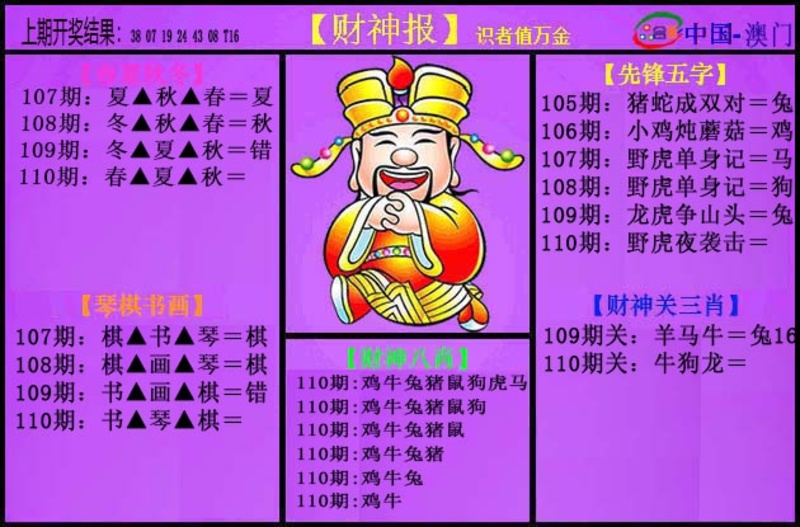 | 108期⑨码 | 37.11.22.38.24.19.05.03.33 | 开:狗45 |